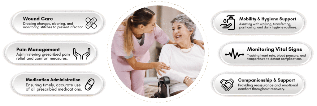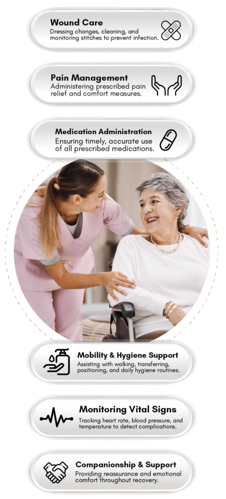 Every patient heals differently. That’s why we adjust wound dressing schedules, medication routines, and mobility support based on the type of surgery and your doctor’s recommendations.